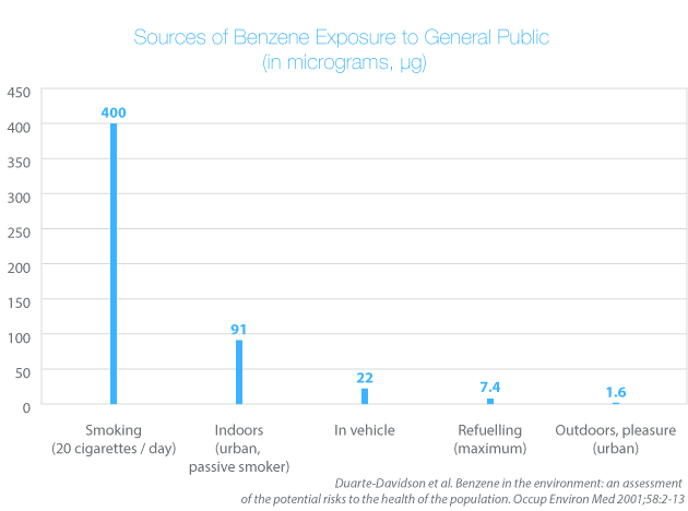 From the table below, it will be seen that the overall daily dose of benzene for any individual is unique, since it depends on life-style. In rural areas, exposure is far lower than in cities. US studies have shown that the contributions to benzene intake from sources such as chemical manufacturing, drinking water, food, beverages and crude oil refining are minimal.